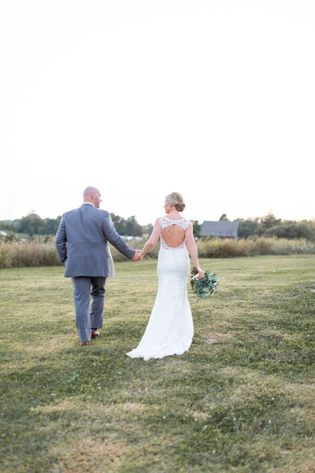 Annemarie chose a casually sophisticated color palette for their wedding, which included plenty of white, cream, brown, blue, and light gray. Her bridal bouquet included fresh eucalyptus, roses, and anemones. The bridesmaids wore floor-length blue dresses while the men sported light gray suits and corresponding blue ties. To play up the rustic charm of the venue, Annemarie selected a variety of lanterns and candle holders to decorate the space. Plenty of fresh greenery provided a pop of color against the venue’s custom-made farm tables.